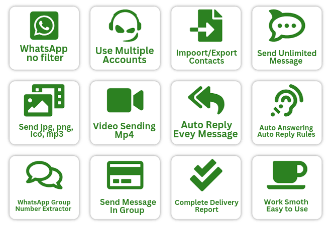 Bulk WhatsApp Marketing Software provides various features like multiple accounts, Unlimited Messages, Multi-multimedia message sending, Numbers Filters, Groups Contacts Grabber, Anti Block modules, Sleep Control, Speed Control, Delay Control, etc.